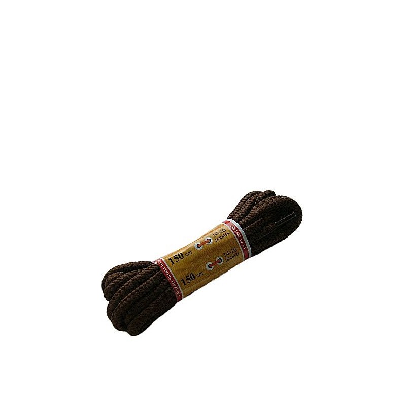Ciemnobrązowe bawełniane okrągłe grube sznurówki do butów. Długość sznurowadeł 150 cm. Idealne do nawlekania przy 14-16 oczkach w cholewce obuwiowej. Grubość 5 mm